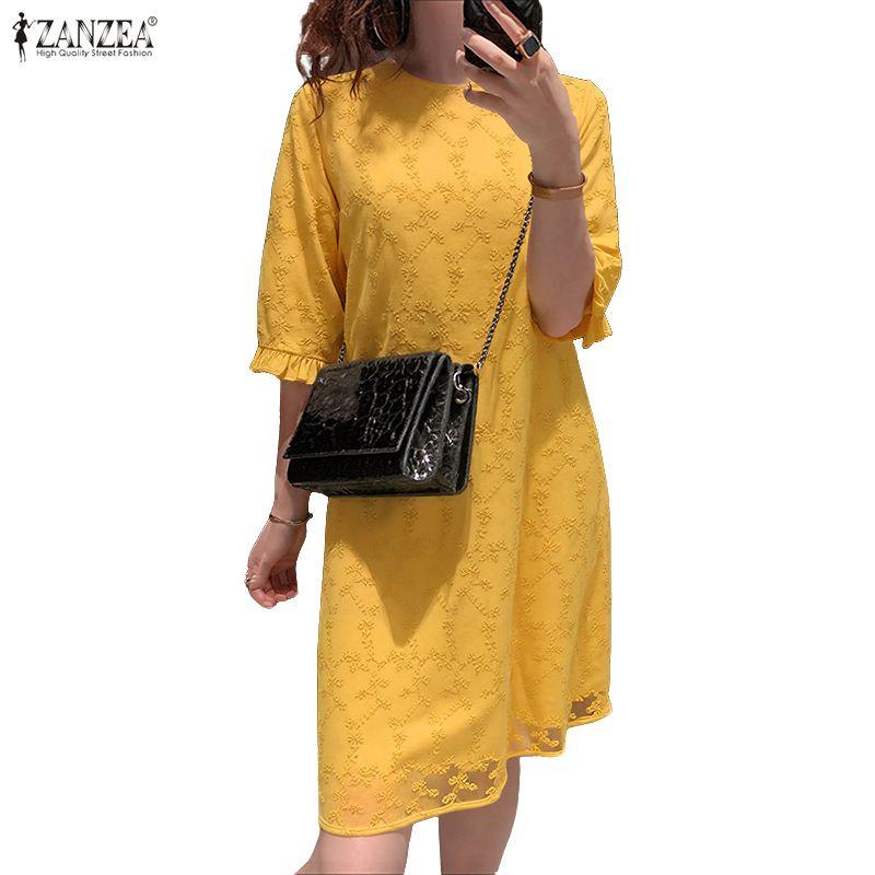 ZANZEA Damen Lässig Rundhals Sommer Halbarm Patchwork Kleid