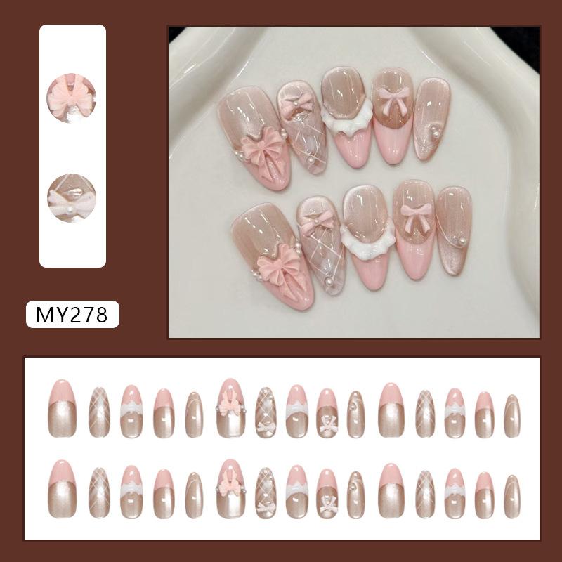 Creme kariert Mädchen Rosa Französische Perle Schleife Katzenauge ins Wind Abnehmbar Tragen Nagel 30 Stück Nagelkunst