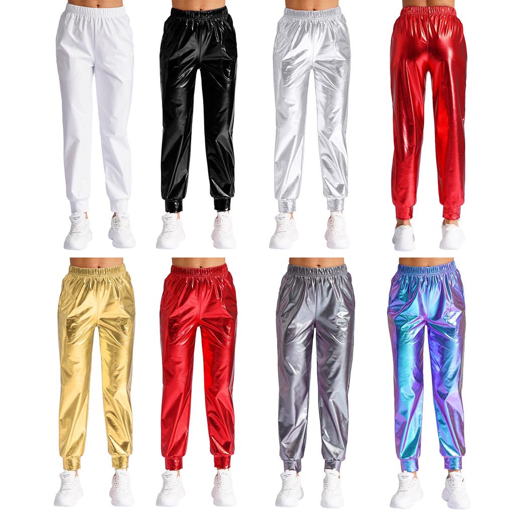 Damen Metallic Tanzhose Hoher Bund Elastischer Bund Lockerer Schnitt Sporthose Glänzender Schimmer Moderne Hose