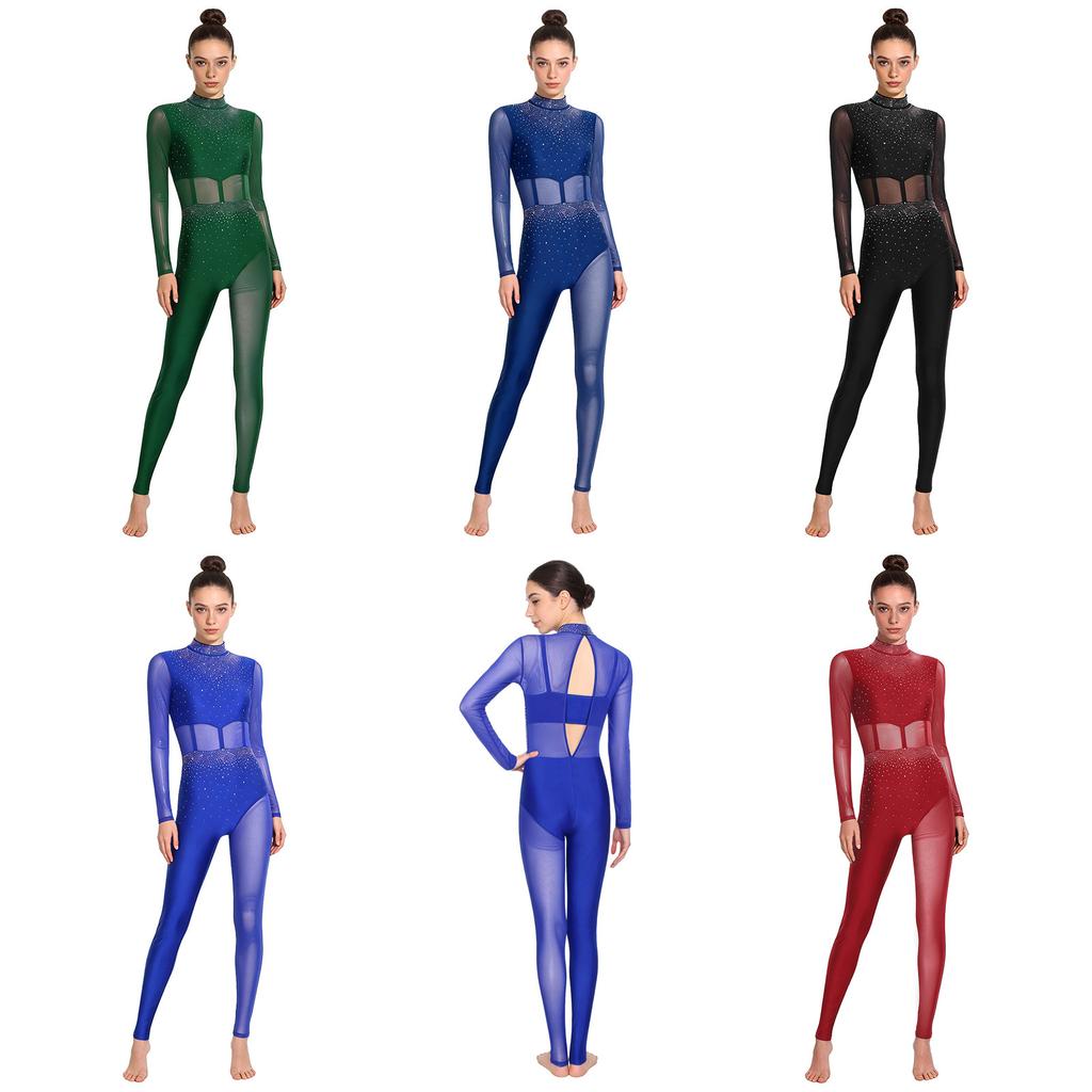 Funkelnder Ganzkörper-Jumpsuit für die Bühne S-XXL: Damen Performance-Kleidung mit durchsichtigen Mesh-Einsätzen und Rückendetail