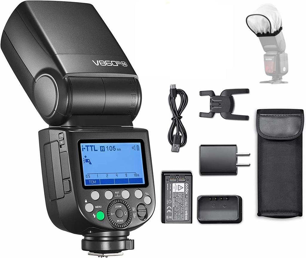 Specifications: Brand: Godox Model: V860III-N Guide No. (1/1 output 200mm): 60 (m ISO 100) Flash Duration: 1/300s to 1/2000s Exposure Control System: TTL auto flash and manual flash Flash Exposure Compensation (FEC): Manual. FEB: ±3 stops in 1/3 stop increments (manual FEC and FEB can be combined). Sync Mode: High-speed sync (up to 1/8000 sec), 1st curtain sync, 2nd curtain sync Multi-flash: Provided (up to 100 times, 199Hz) Wireless Flash Function: Transmitter, Receiver, Off Transmitter Group: A, B, C, D Transmission Range (approx.): 100m Channel: 32 (1-32) Controllable Receiver Group: A, B, C, D, E (E group can be controlled by X-series flash trigger) Power Supply: 7.2V 3000mAh Li-ion Polymer Battery Recycle Time: Less than 1.5 seconds. Green LED indicator lights up when the flash is ready Full Power Flash: Approx. 480 Power Saving: Automatically powers off after approx. 30 seconds.