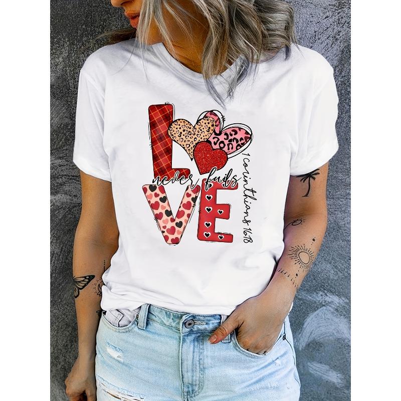 Europäische Größe Damen Valentinstag Liebesbrief T-Shirt Kurzarm Rundhals Oberteil mit Leopardenmuster & Karierten Herzen Lässige Frühling Sommer Outfits