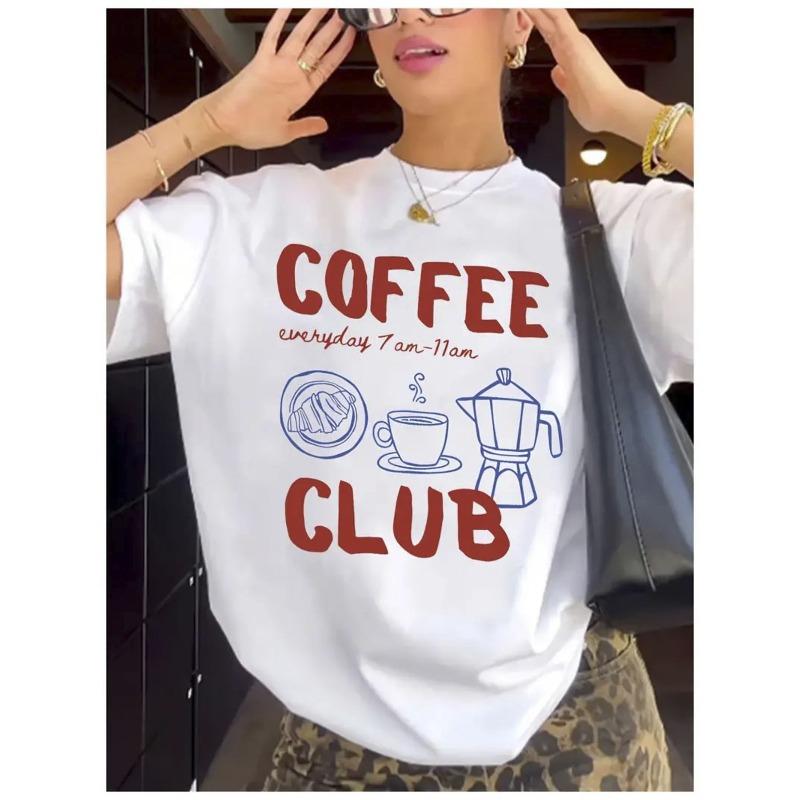 Europäische Größe Kaffeeliebhaber Grafik-T-Shirt Entspannte Passform Kurzarm Rundhalsausschnitt Oberteil mit Kaffeetasse und Bohnen-Print, Lässige Kleidung Kaffeeclub Design