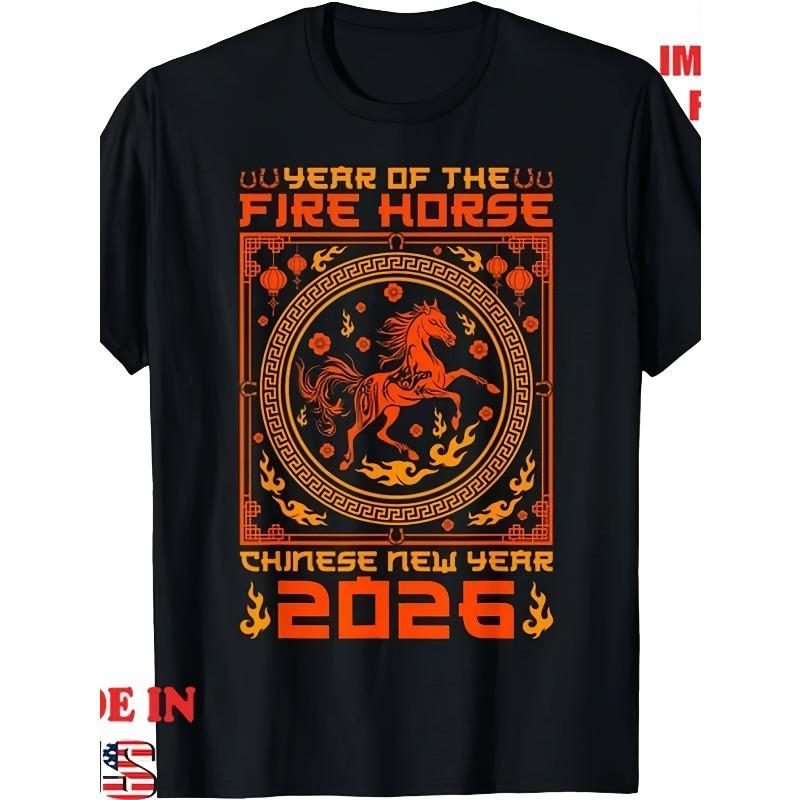 Europäische Größe Jahr des Feuerpferdes Chinesisches Neujahr 2026 T-Shirt, Erwachsenen-T-Shirt für Damen 2025 Sommer Kurzarm bedrucktes T-Shirt