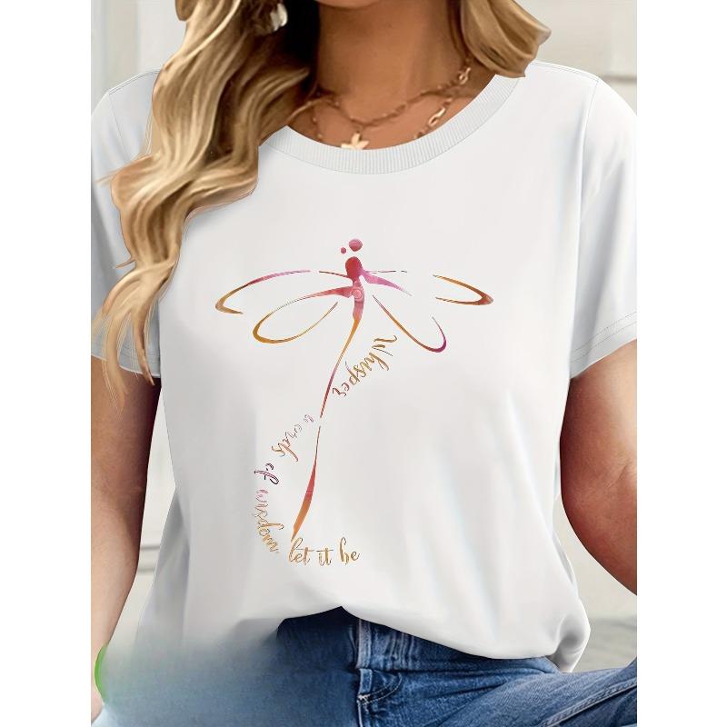 Europäische Größe Damen&Apos;S Libellen-Print T-Shirt, Lässiges Rundhals-Kurzarm-T-Shirt, Frühling/Sommer Basic Alltagsbekleidung, Maschinenwaschbar, Grafik-T