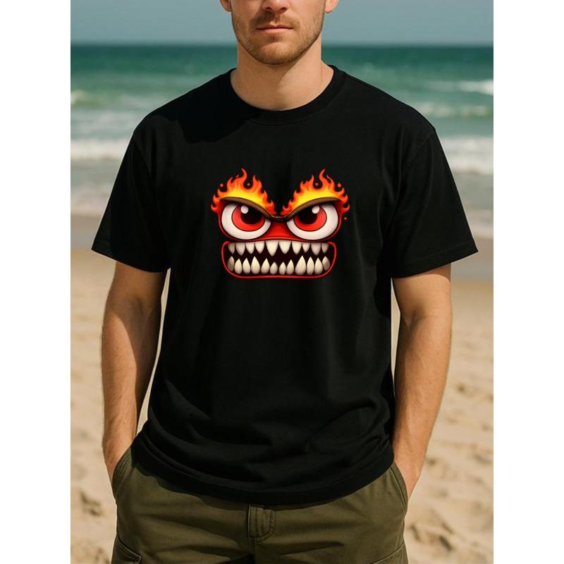 Europäische Größen Flammenmonster Lustiger Aufdruck, Herrenbekleidung, Lässiges Kurzarm-T-Shirt, Herren Lässiges Kurzarm-Rundhals Musterbedrucktes T-Shirt