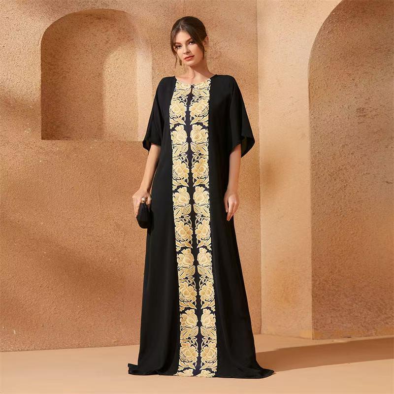 Schwarz-Gold Östlich-Ethnisch Bedrucktes Langes Robenkleid
