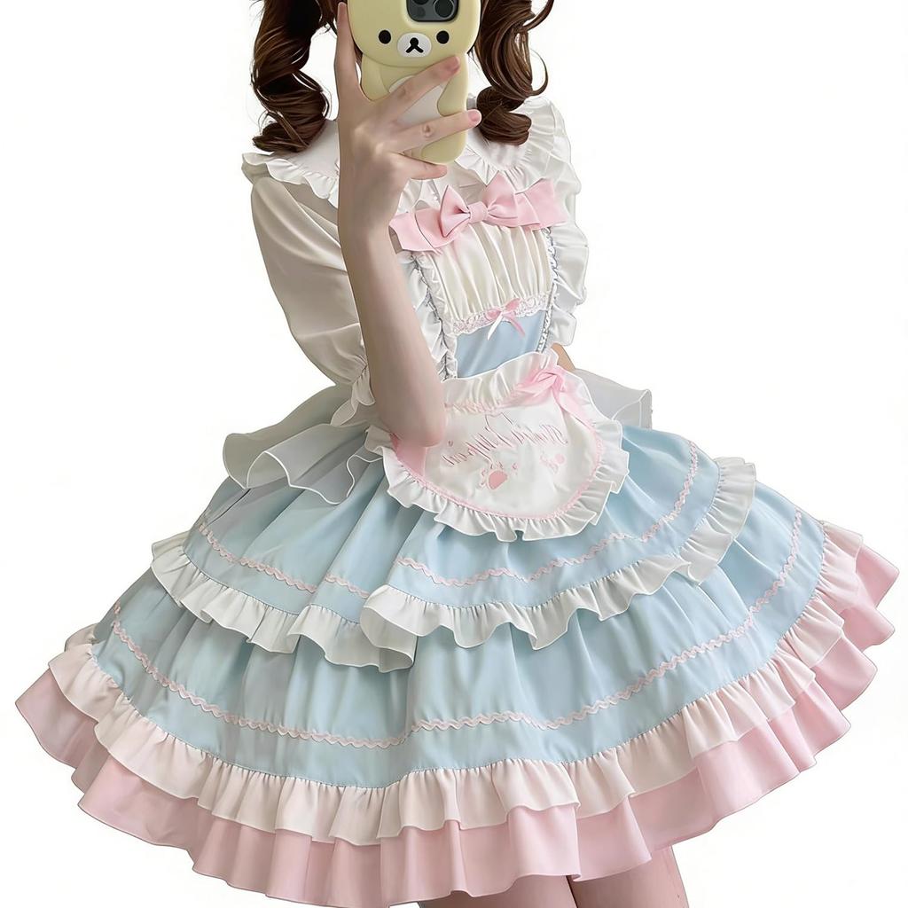 ★Lolita-Kleid, Kurzarm (5-teiliges Set): Kleid, Schürze, Zwei Bänder und ein Kurzarmhemd. Dieses stilvolle Lolita-Outfit im Prinzessinnenstil ist perfekt für Cosplay.. Das einzigartige Design basiert auf einem niedlichen Mori-Girl-Thema und strahlt eine Gothic-Lolita-Atmosphäre aus.
