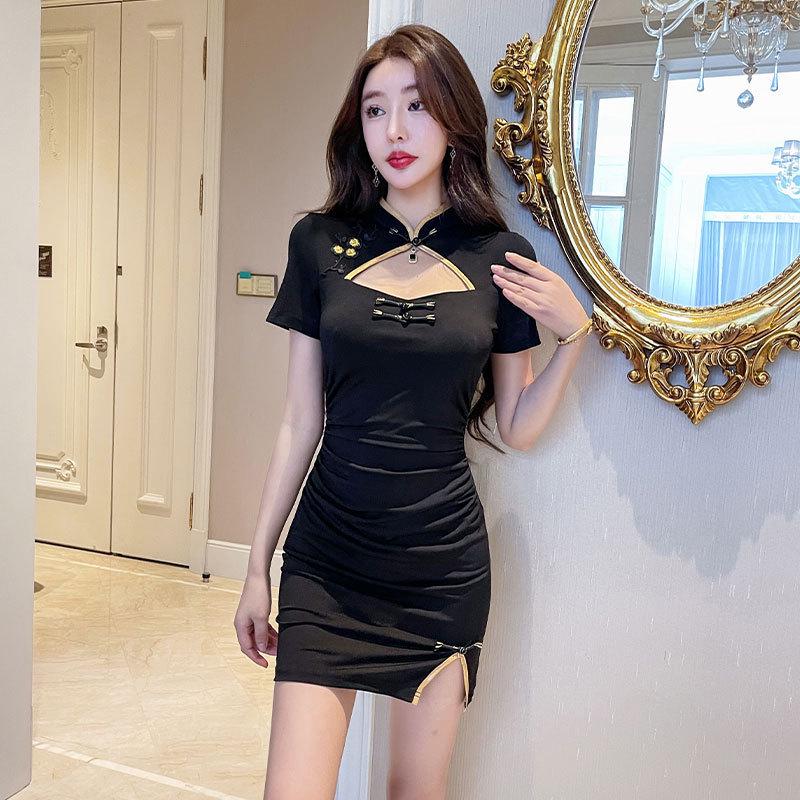 Elevate your evening style with this alluring and sophisticated black qipao dress, designed to enhance your summer nightclub outings. Crafted from quality polyester, this dress features a seductive low-cut design and a hip-hugging fit that accentuates your curves, making it the ideal choice for women who appreciate bold, yet elegant fashion. Perfect for making a statement, this dress combines traditional elements with a modern twist, offering a unique and captivating look for any night out.