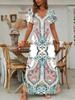 Umarme mühelosen Stil mit diesem im Bohemian-Stil gehaltenen Kleid, das mit einem verspielten Print und einem schmeichelhaften V-Ausschnitt-Design besticht.. Dieses A-Linien-Kleid aus weichem Polyester fällt mit seiner langen, fließenden Silhouette wunderschön.. Die kurzen Ärmel verleihen einen luftigen Touch und machen es perfekt für Anlässe bei warmem Wetter.. Egal, ob Sie zu einer Gartenparty gehen oder einen entspannten Tag verbringen, dieses Kleid bietet Komfort und eine lockere Boho-Atmosphäre.
