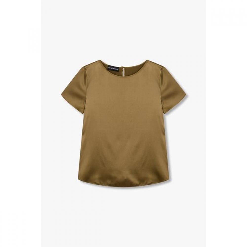 The Emporio Armani Women's Silk Stretch Blouse A525103504 offers a stylish outfit that pairs well with skirts or chino pants. Made from a soft, stretchy silk blend, it provides a comfortable wearing experience. The blouse features a short sleeve design, crew neck detailing, and a back loop closure.