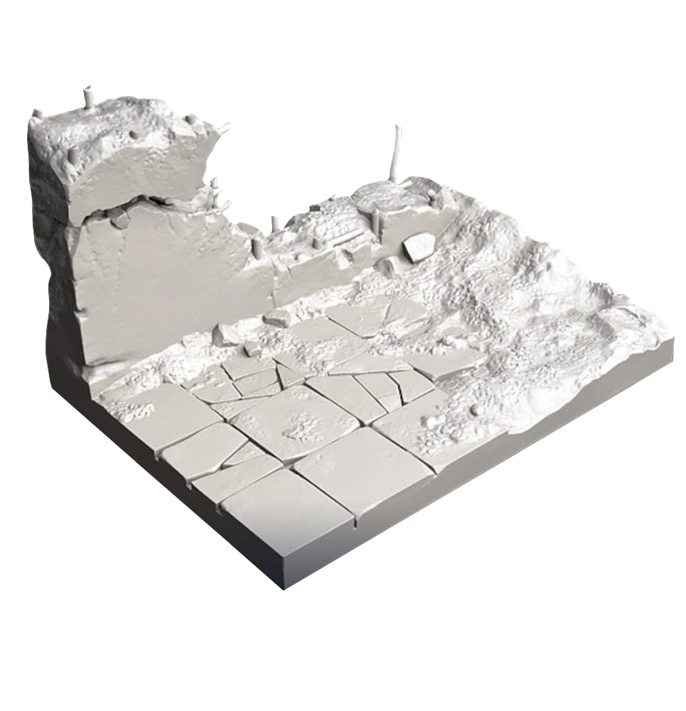 Eine Vignette-große Displaybasis, die die durch den Kampf der Mutanten verursachte verwüstete Stadtlandschaft nachbildet.