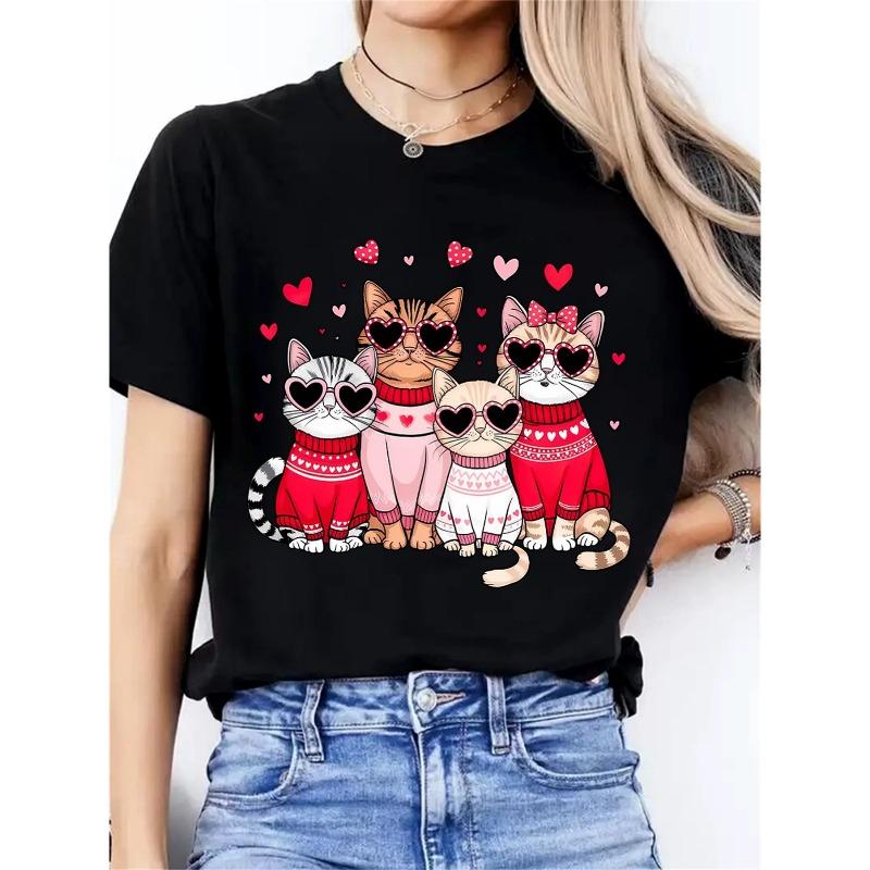 European size Cute cat valentine's day gift heart love holiday theme novelty print new style women's round collar casual sports comfortable T-shirt