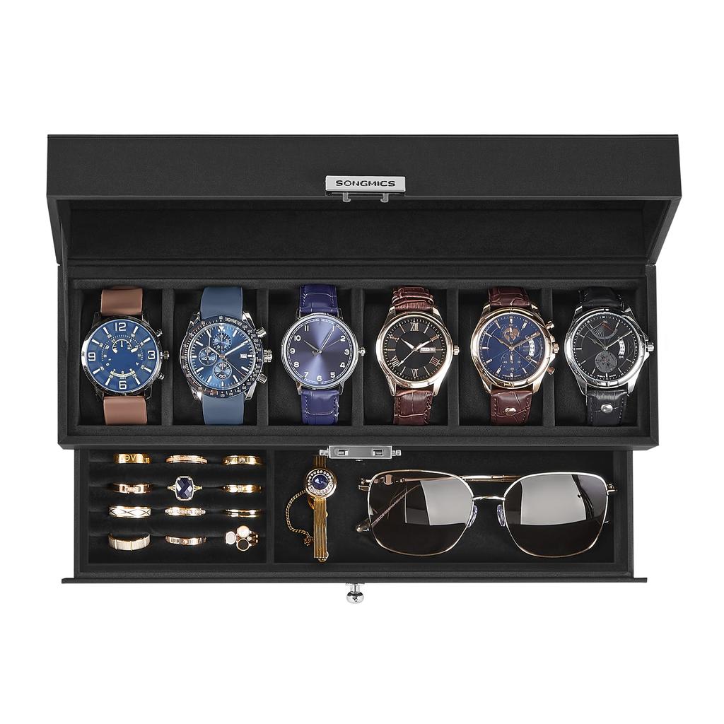 Convenient two-tier storage: The top tier can hold six watches up to 48mm in dial size. The bottom drawer is perfect for organizing various jewelry such as necklaces, rings, and earrings.