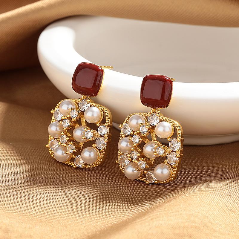 Korean High-end Glitter Diamond Pearl Earrings, Women's Retro Temperament, Encore Red Drip Oil Stud Earrings, Versatile Earrings