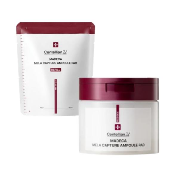 This special set includes one full-size Madeca Mela Capture Ampoule Pad (60 pads) and one refill pack (60 pads) for extended brightening care. Formulated with niacinamide, tranexamic acid, and Centella Asiatica extract, it helps visibly reduce dark spots and uneven skin tone while soothing sensitive skin. The dual-textured pads gently exfoliate and deliver concentrated ampoule essence for clearer, smoother, and more radiant skin. Perfect for daily tone correction and long-term spot management.