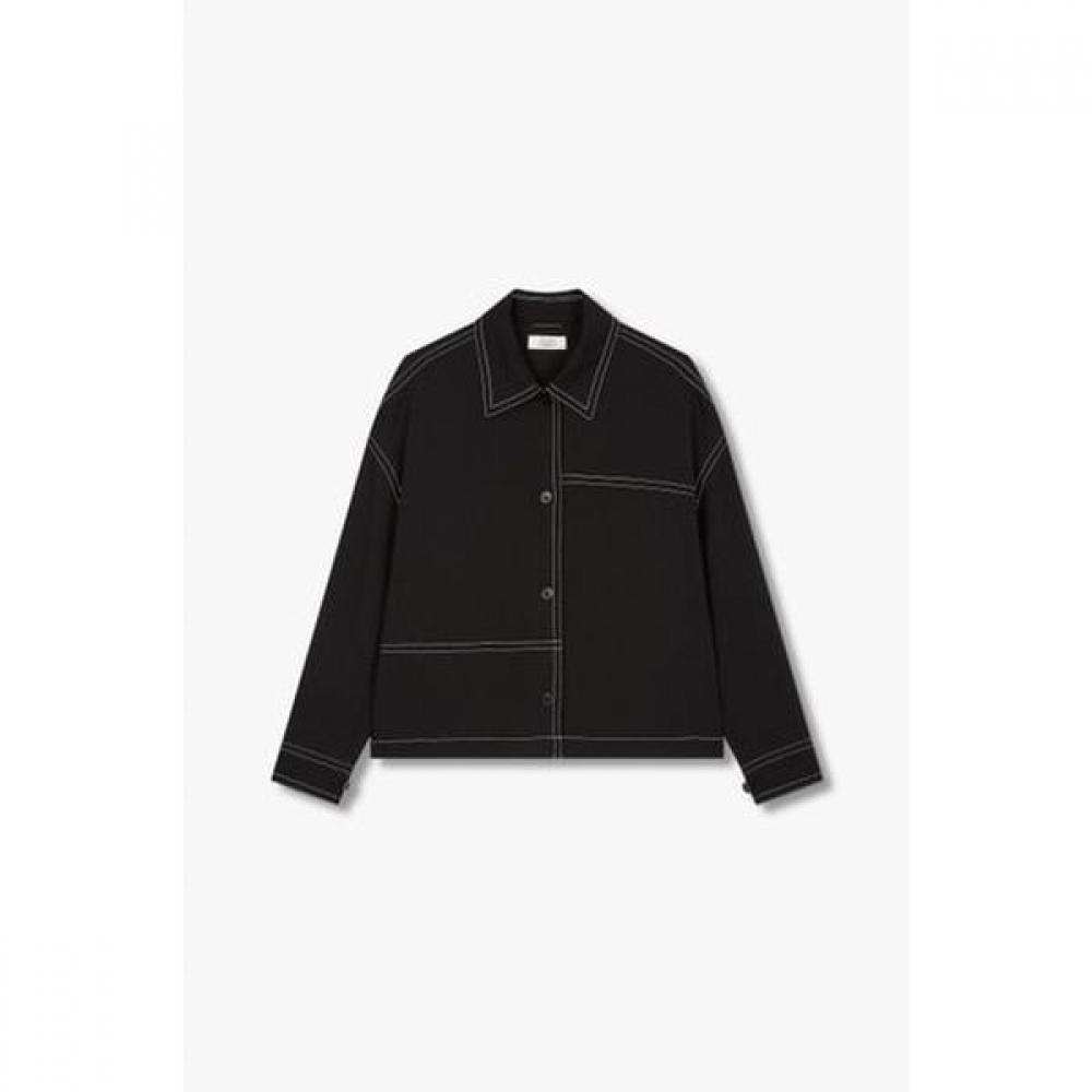 This blouse is made from a polyester-rayon blend, offering a lightweight and wrinkle-resistant fabric with a flowing feel. The oversized design allows for comfortable wear, and the basic collar along with cut seam points and overall color stitching makes it a distinctive design that exudes a semi-casual mood.