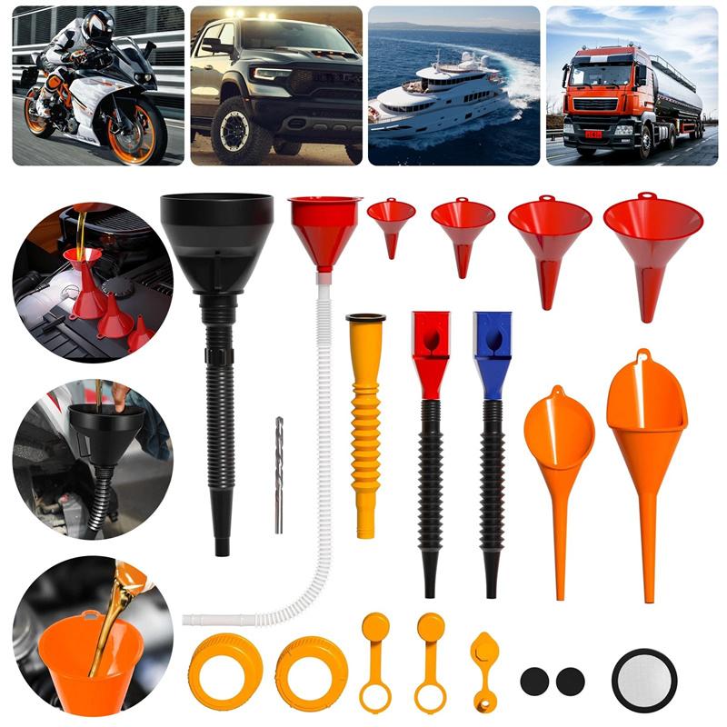⚒️ Mehrere Trichtergrößen für unterschiedliche Bedürfnisse: Enthält Trichter in verschiedenen Durchmessern für unterschiedliche Öffnungen und Flüssigkeitstypen. Die klassischen roten Trichter sind ideal für den universellen Einsatz, während die Trichter mit langem Hals helfen, Leckagen beim Befüllen von engen oder versenkten Behältern zu reduzieren.