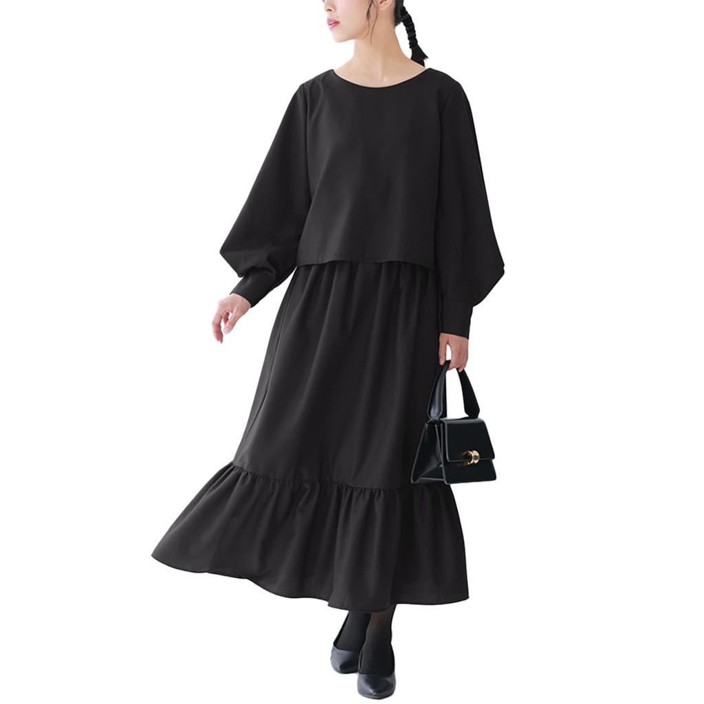 The dress features voluminous sleeves and a tiered design, and the layered top design and long cuffs on the sleeves create a sharp impression. The waist and tiered transitions are carefully placed to enhance your figure.