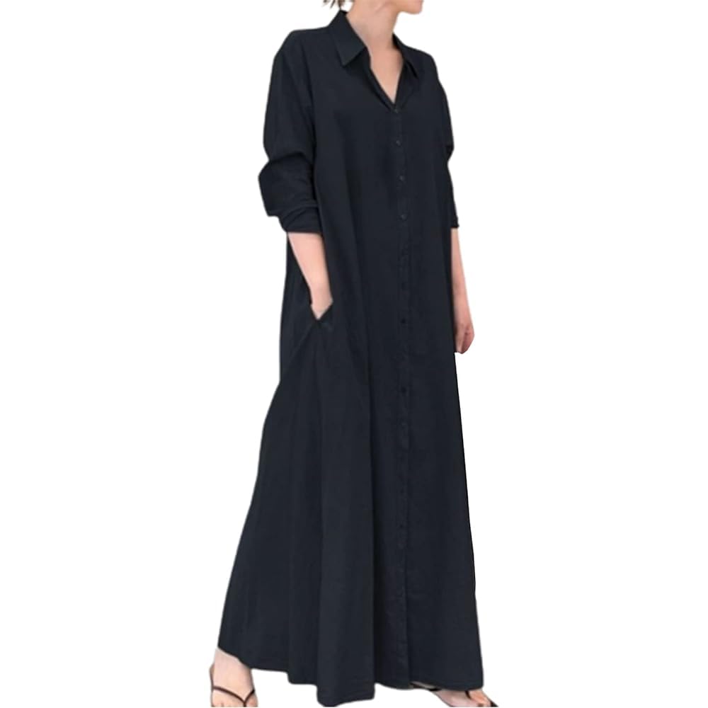 [Front-Opening Long Dress for Women] Made with a sturdy cotton blend material that's gentle on the skin, this shirt dress features a simple, solid design. Its moderate thickness and breathability make it comfortable and natural to wear. This A-line maxi dress flatters your figure, and its understated design makes it versatile for many seasons.