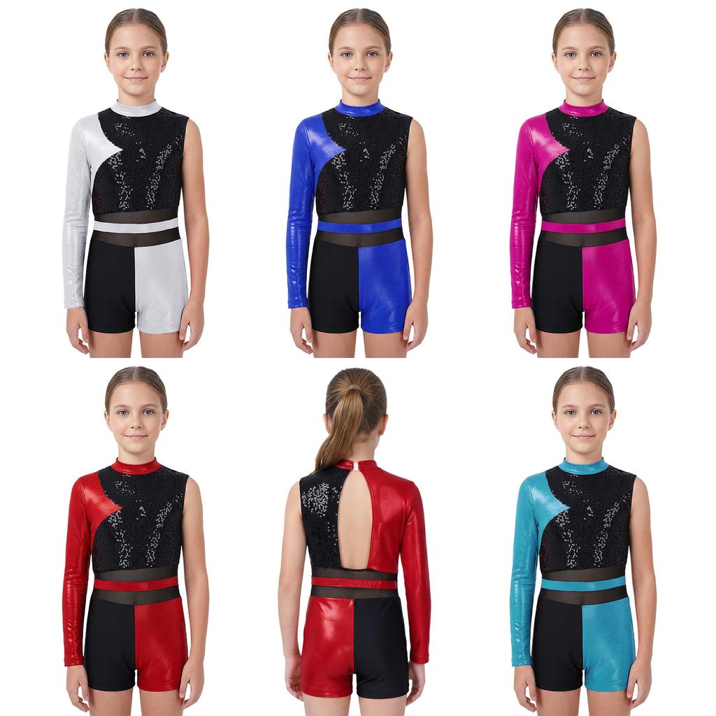 Kids Girls Gymnastics Dance Asymmetrical Jumpsuit Cutout Back Glittery Sequins Color Block Patchwork Metallic Leotard Dancewear