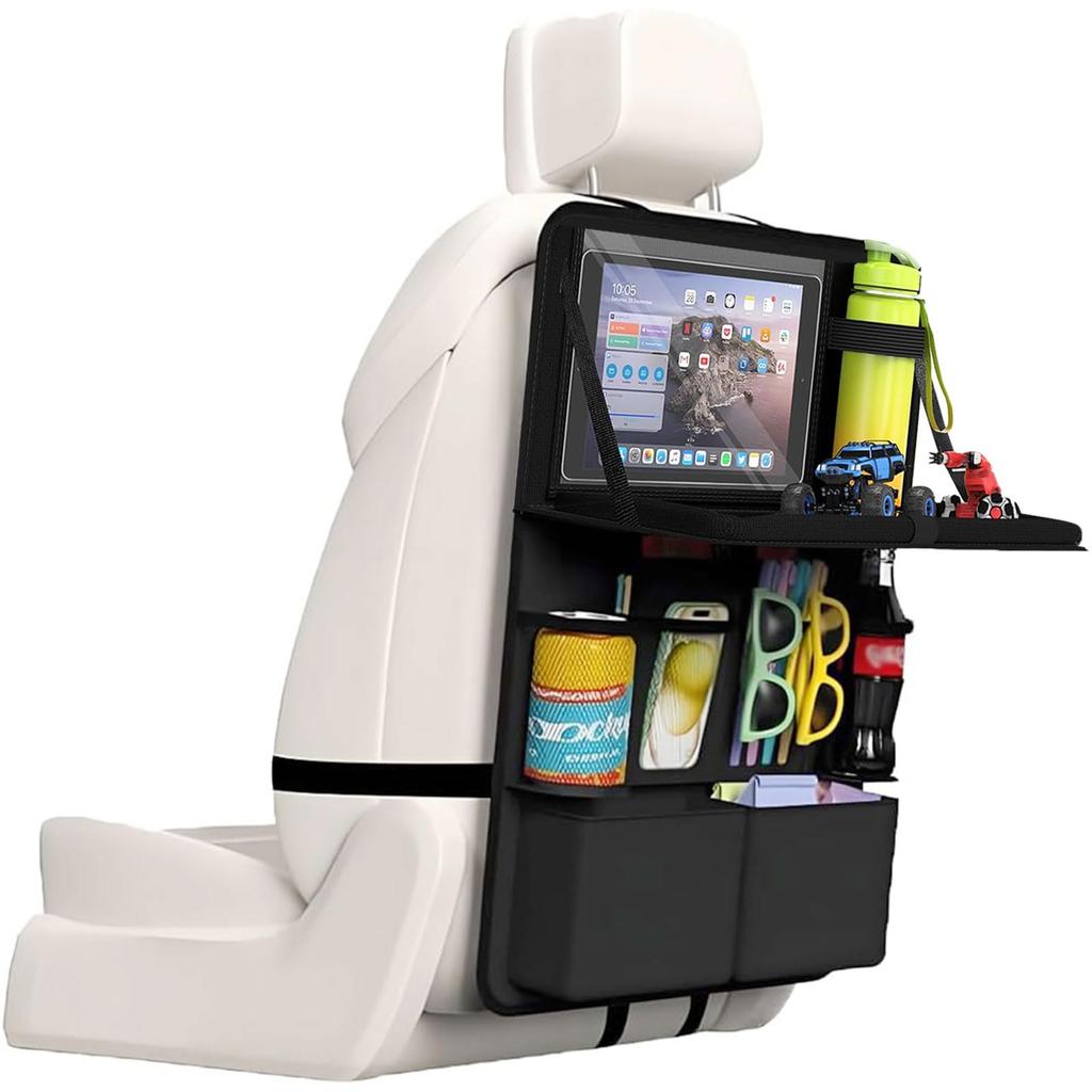 Machen Sie sich Sorgen um den Stauraum und Trittverletzungen durch Kinder? Der AKARzmellx Sitzrücken-Organizer ist ein multifunktionaler Gegenstand, der Ihren Rücksitz ordentlich hält und eine komfortable Fahrt gewährleistet.. Produktspezifikationen: Material: Hauptkörper: 600D Oxford Stoff (wasserabweisend und schmutzabweisend), Festen Riemen: Polyester. Produktgröße: Ca.. 61cm B x 42cm H x 1cm T (Dicke im eingebauten Zustand). Schreibtischgröße: Ca.. 42cm B x 22cm T. Gewichtskapazität: Schreibtischoberfläche: Maximal 10kg. Tablet-kompatibel: Geräte bis 11 Zoll (iPad Pro 12,9 Zoll) und bis zu 18x25cm groß. Geeignet für die meisten Rücksitze von Autos (mit Sitzkopfstützen). Produkteigenschaften: Praktisches 3-Wege-Design: Verwenden Sie es als Aufbewahrungs-Organizer für kleine Gegenstände, als Klapptisch für Snacks oder die Arbeit und als Schutz vor Stößen, um die Rückseite des Sitzes zu schützen.. Dieses einzelne Produkt löst alle Ihre Autobedürfnisse. 11 durchdachte Aufbewahrungsfächer: Eine transparente PVC-Tasche ermöglicht die Bedienung Ihres Tablets, während es sich darin befindet.. Die **Netztasche** macht es einfach zu sehen, was sich darin befindet, und die **Stofftasche** verhindert, dass kleine Gegenstände herausfallen.