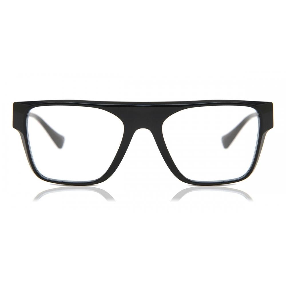 The Versace VE3326U 5380 Men's Glasses feature a rectangular full rim design and oversized lens front. The lenses come with transparent demo lenses that can be replaced by prescription lenses if desired. A transparent coating is applied for improved scratch and fingerprint resistance, but UV protection is minimal or absent, making it suitable for indoor or low-light environments. When using, check the sizes to ensure the correct fit and prepare your prescription if needed for purchase.