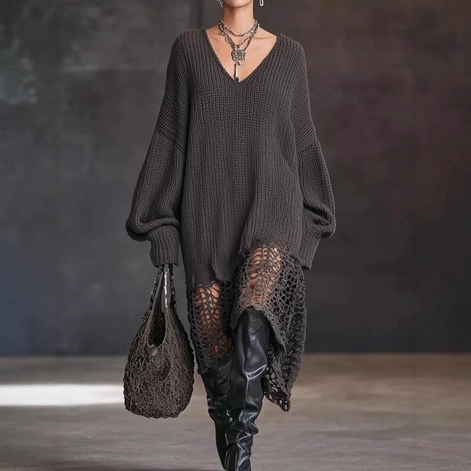 Entdecken Sie eine stilvolle Mischung aus europäischer und amerikanischer Mode mit diesem V-Ausschnitt-Strickkleid, das einen schicken unregelmäßigen Saum und ein auffälliges Hohlmuster aufweist.. Hergestellt aus hochwertigem Acryl, bietet dieses Kleid eine weiche und bequeme Passform, perfekt für jede Jahreszeit.. Das einfarbige Muster sorgt für einen schlichten und eleganten Look, während die ausgefranste Dekoration einen Hauch von moderner Lässigkeit verleiht.. Ideal für lässige Ausflüge oder besondere Anlässe, dieses Kleid vereint mühelos Komfort und Stil.