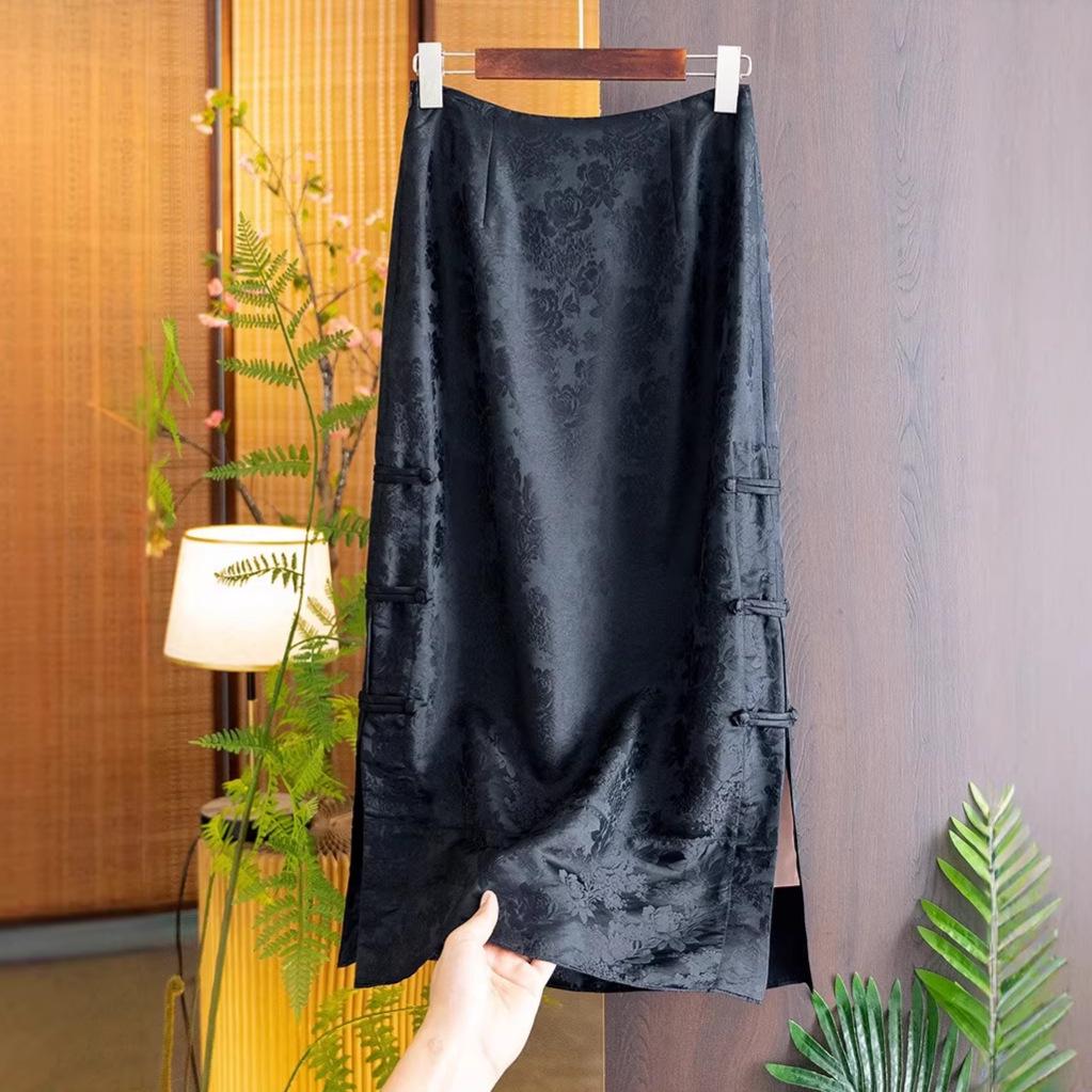 2026 Spring/Summer Women's Black Silk Midi Skirt - Chinese National Style, Jacquard A-line with Slit