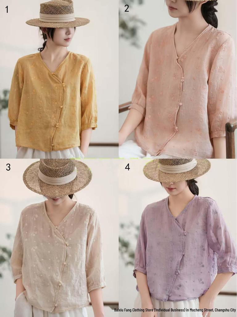 Embroidered Ramie V-Neck Asymmetrical Chinese-Style Loose Shirt with 3/4 Sleeves for Women - Summer 2026 Collection