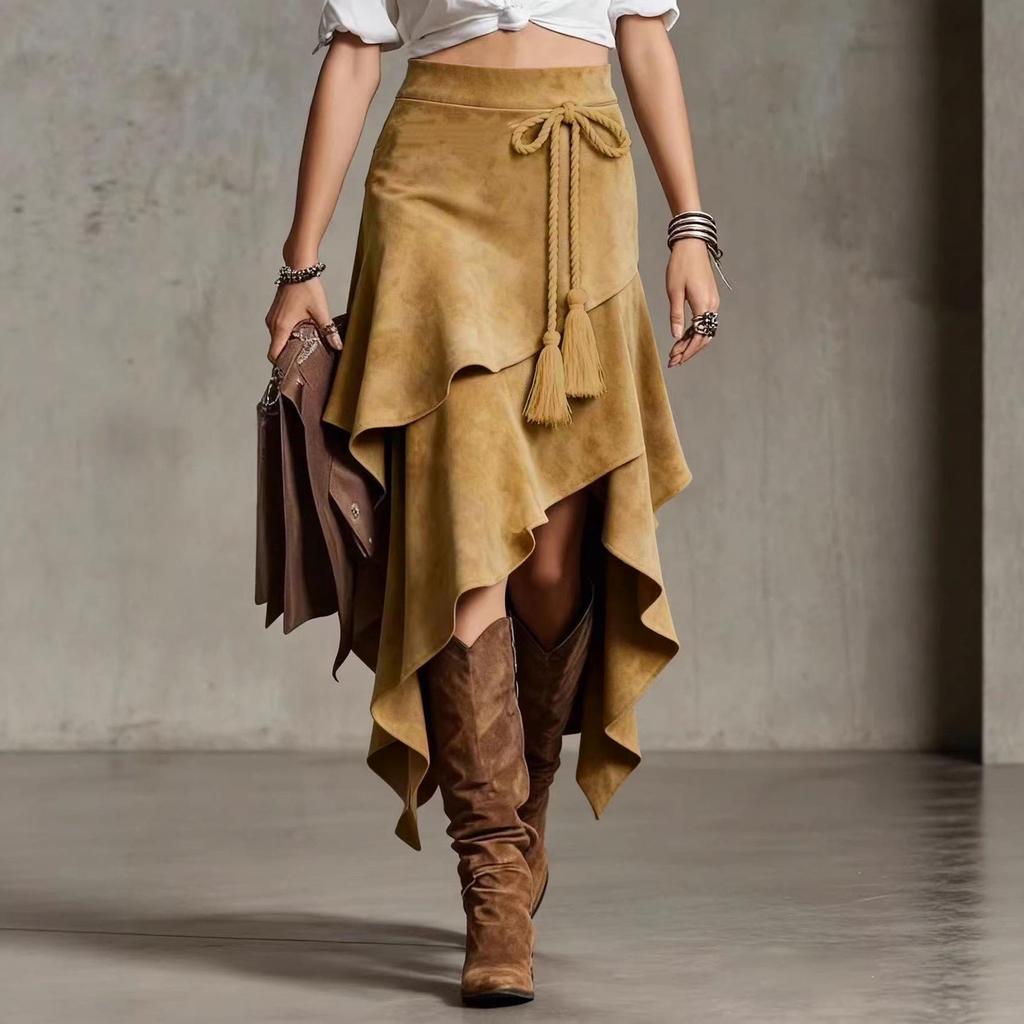Entdecken Sie die Eleganz und den Charme der Kollektion 2026 mit diesem unregelmäßigen Retro-Wildlederrock im europäischen Westernstil.. Entworfen für die modebewusste Person, besticht dieser Rock durch ein einfarbiges Muster, das jede Garderobe ergänzt.. Hergestellt aus hochwertigem Polyestergewebe, bietet es das luxuriöse Gefühl von Wildleder mit der Haltbarkeit moderner Materialien.. Perfekt für legere Anlässe, verkörpert dieser Rock mit seinem einzigartigen unregelmäßigen Design einen schicken Westernstil und ist somit eine vielseitige Ergänzung für jedes Mode-Ensemble.