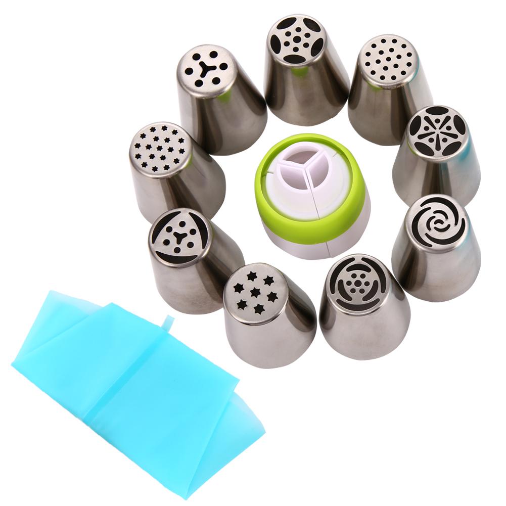 Cake Decorating Supplies Russian Piping Tips 11-Pcs Sets(9 Russian Tips,1 Disposable Pastry Bag 1 Tri-Color Coupler)