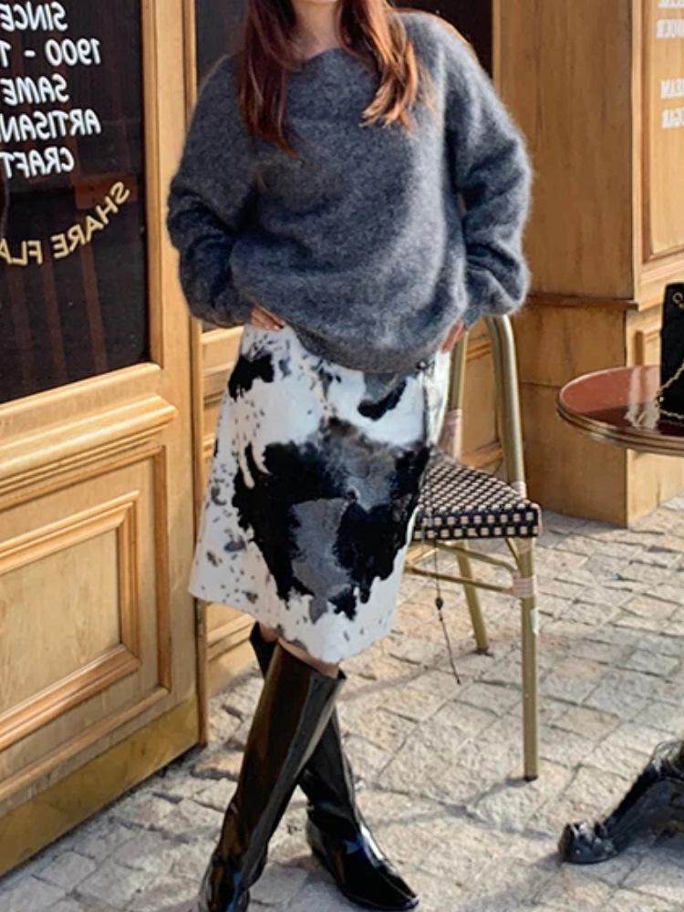 BLUETIQU Umweltfreundlicher flauschiger Kuhmuster-Fellimitat-Rock mit Taillenband