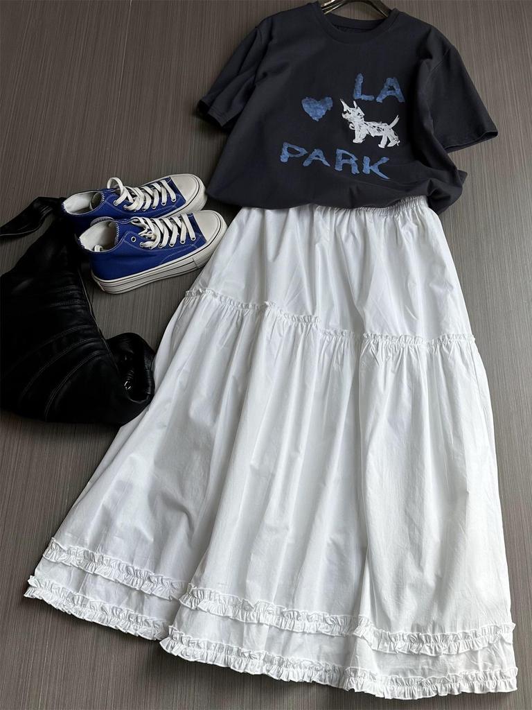 Spring 2026 High Waist Patchwork Wood Ear Ruffle Korean Style Long Cake Skirt