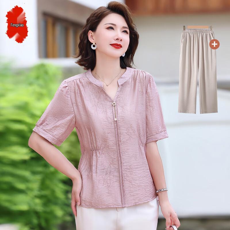 Middle-Aged Women's Stylish Short Sleeve Top & Wide-Leg Pants Set
