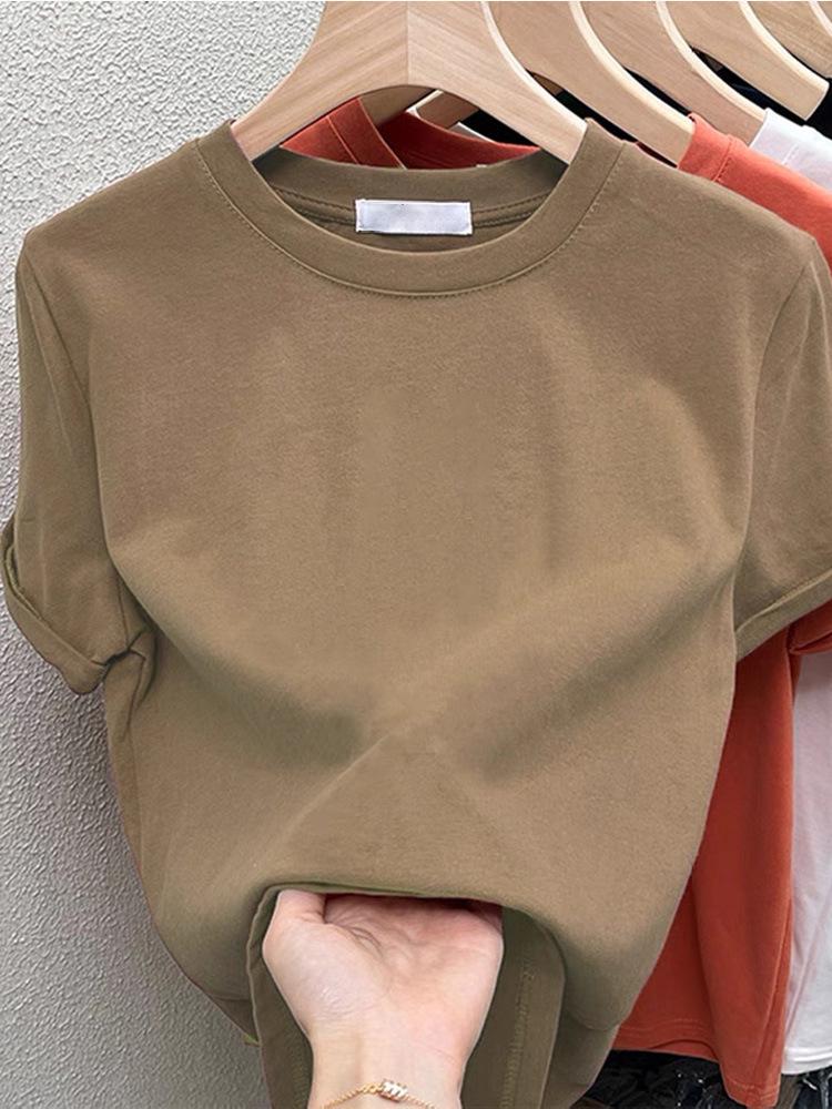 Elevate your wardrobe with this chic and versatile women's T-shirt, perfect for spring, summer, and autumn. Crafted from high-quality cotton, this solid-patterned T-shirt offers a soft and comfortable feel. The brushed cotton material enhances its appeal, providing a smooth texture. Featuring a classic round neckline and short sleeves, this T-shirt combines comfort and style seamlessly, delivering a youthful and age-reducing look for any casual occasion.