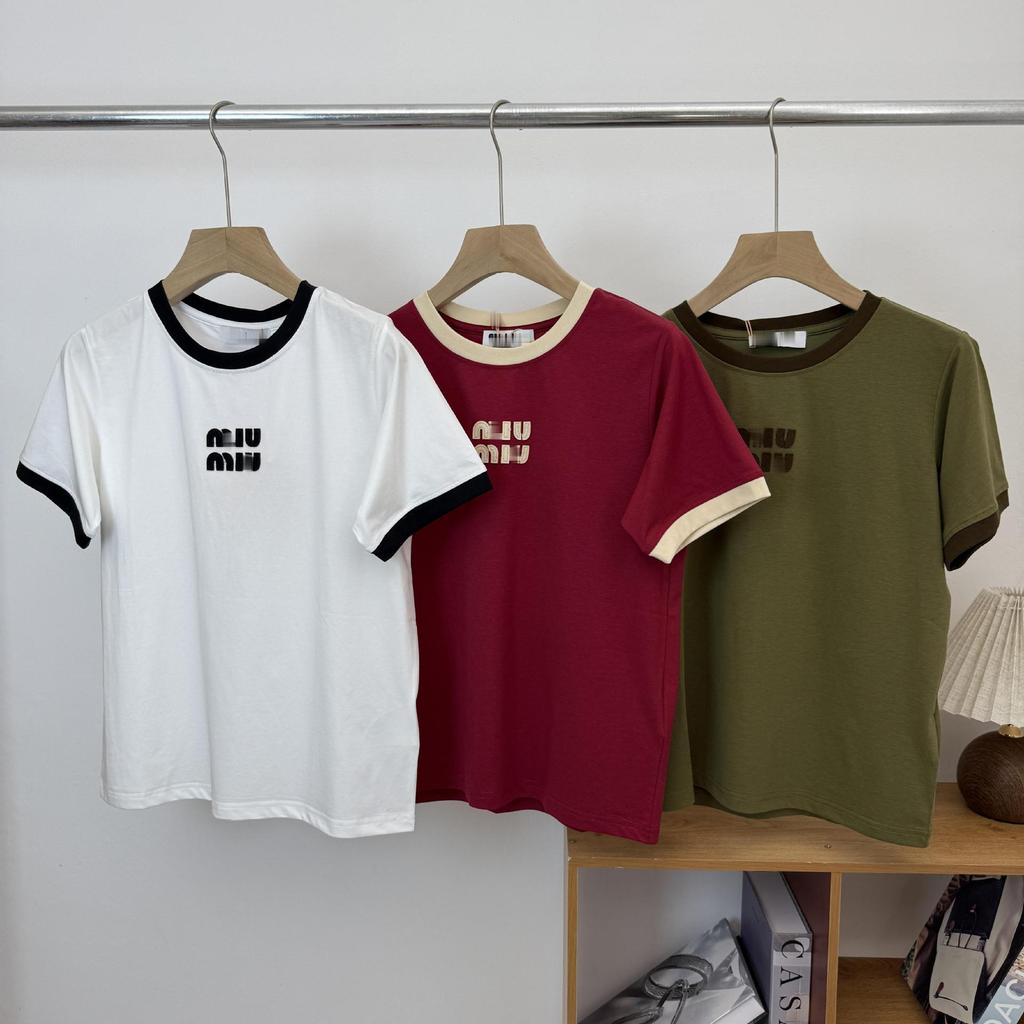 Miu Miu Damen Frühling/Sommer 2026 Klassisches Baumwoll-T-Shirt mit gesticktem Logo, Rundhalsausschnitt, Kurze Ärmel, Unifarben