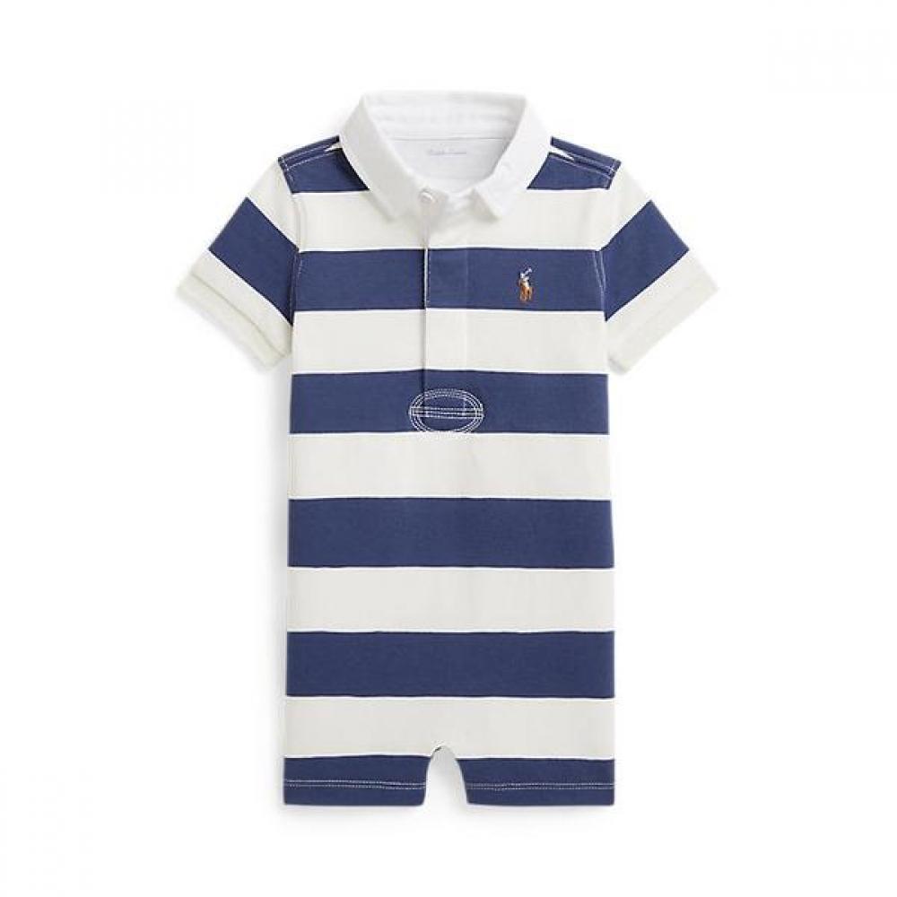 The Polo Ralph Lauren Boy's Stripe Cotton Rugby Shortall (CWPOOPCIC720345400) is a rugby-style onesie for newborns and infants, featuring bold stripe patterns and a twill collar.