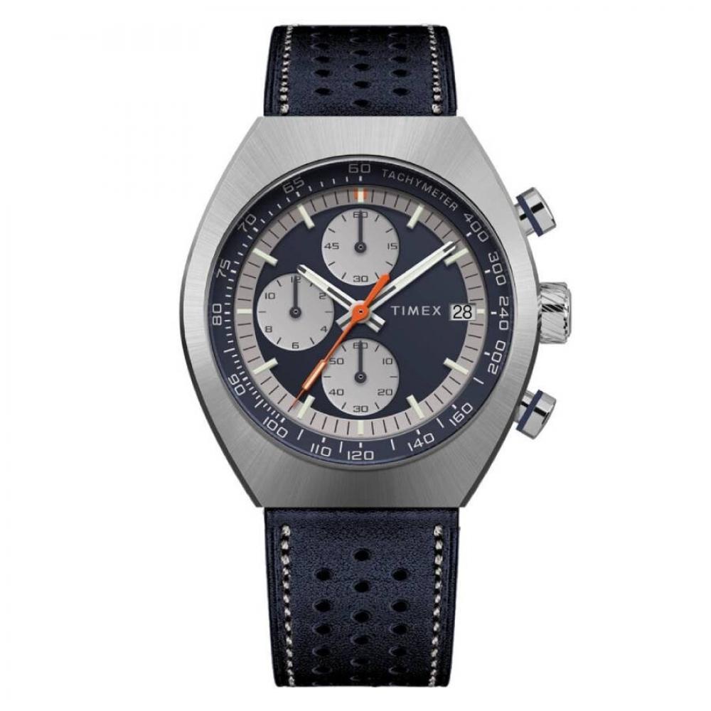 Gehäuse aus silberfarbenem Edelstahl mit einem blauen Lederarmband. Feste silberfarbene Lünette aus Edelstahl. Blaues Zifferblatt mit silberfarbenen Zeigern und Index-Stundenmarkierungen. Minutenmarkierungen am äußeren Rand. Wähltyp: Analog. Datumsanzeige auf der 3-Uhr-Position. Chronograph – drei Hilfszifferblätter anzeigen: 60 Sekunden, 60 Minuten und 12 Stunden. Quarzwerk. Kratzfestes Mineralglas. Krone ziehen/drücken. Solider Gehäuseboden. Tonneau-Gehäuseform, Gehäusegröße: 42 mm, Gehäusedicke: 11 mm. Bandbreite: 22 mm. Schnallenverschluss. Wasserdicht bis 50 Meter / 165 Fuß. Funktionen: Chronograph, Datum, Stunde, Minute, Sekunde. Legacy-Serie. Stil einer Sportuhr. Artikelvariationen: TW2W93500VQ. Timex Legacy Chronograph Quarz Blaues Zifferblatt Herrenuhr TW2W93500.
