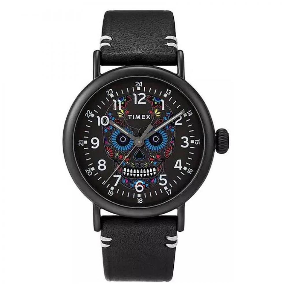 Die Timex Standard Dia de los Muertos Quarz Herrenuhr TW2U95200 verfügt über ein schwarzes Edelstahlgehäuse, kombiniert mit einem schwarzen Lederarmband.. Sie hat eine feste schwarze Edelstahl-Lünette und ein schwarzes Zifferblatt mit schwarzen Zeigern und arabischen Ziffern als Stundenmarkierungen.. Diese analoge Uhr verfügt über eine leuchtende Indiglo-Funktion und wird von einem Quarzwerk angetrieben.. Die Uhr verfügt über ein kratzfestes Mineralglas, eine Zug-/Druckkrone und einen massiven Gehäuseboden.. Die runde Gehäuseform hat einen Durchmesser von 40 mm und beinhaltet eine Dornschließe.. Zusätzlich ist es bis zu 50 Meter wasserdicht. (165 Fuß) und bietet Funktionen für Stunden-, Minuten- und Sekundensanzeige.