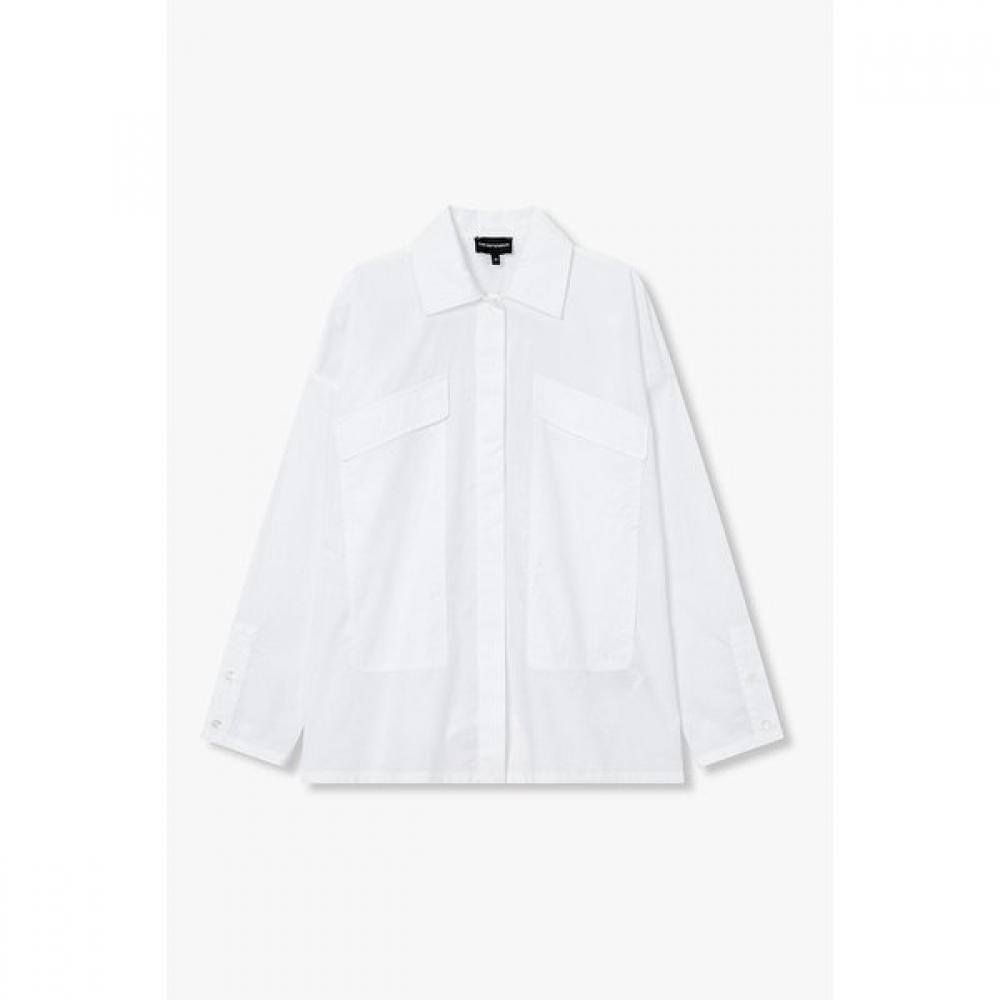The 25 F/W Women's Long Sleeve Flap Pocket Shirt is crafted from soft cotton fabric, providing a comfortable fit.