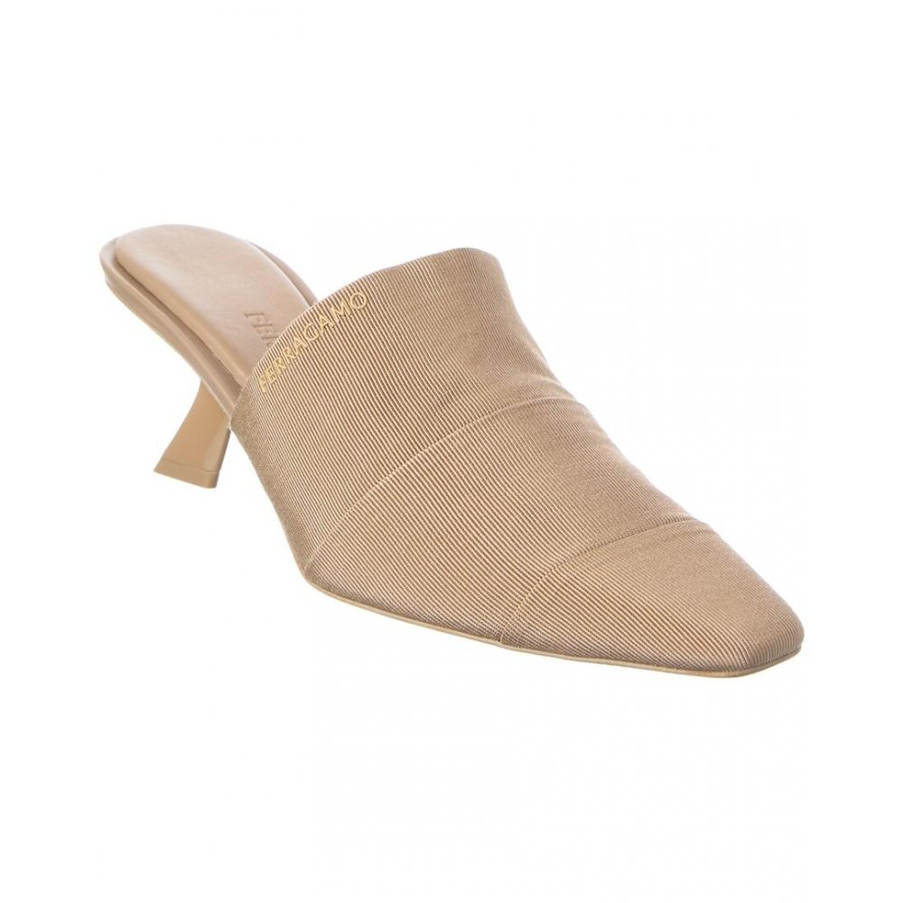 The Salvatore Ferragamo Algedi Grosgrain Mule is a stylish mule made in Italy. It features a beige grosgrain material adorned with logo lettering, giving it a sophisticated touch. The lightly padded leather insole and smooth leather sole provide comfort for all-day wear. The 2.5-inch heel adds a subtle lift to your outfit.