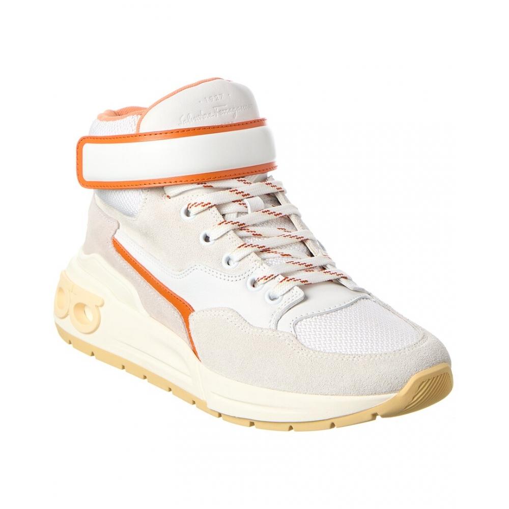 Elevate your streetwear style with the Salvatore Ferragamo Leather High-Top Sneaker. Made in Italy, this sneaker features a vibrant orange leather and mesh upper with a Velcro strap for a secure fit. The lace-up closure and moderately padded footbed provide comfort, while the rubber sole ensures stability.