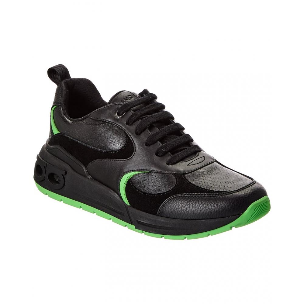 Elevate your casual style with the Ferragamo Leather & Suede Sneaker. Crafted in Italy, this sleek sneaker features a combination of black and green leather and suede with silver-tone hardware and perforated detailing for a modern look. The lightly padded leather insole and rubber sole provide comfort and traction for all-day wear.