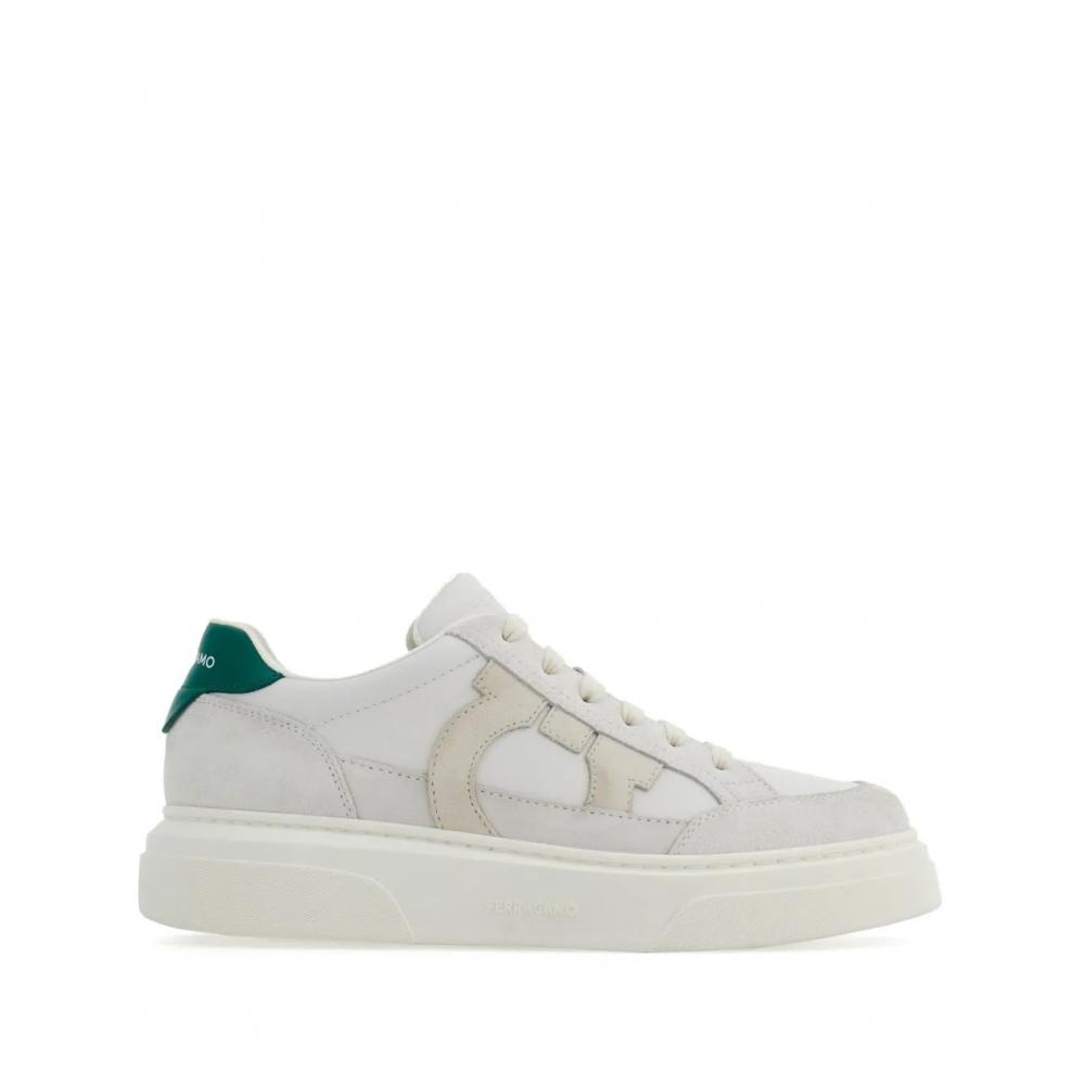 The Salvatore Ferragamo Gancini Patch Calfskin Sneakers are a blend of refined design and luxury. They feature an optical white and cream white color scheme, with a front lace-up design. The round toe style, along with a contrasting branded heel counter, exudes classic charm. The side is adorned with a Gancini patch, and the chunky rubber sole provides both comfort and style.