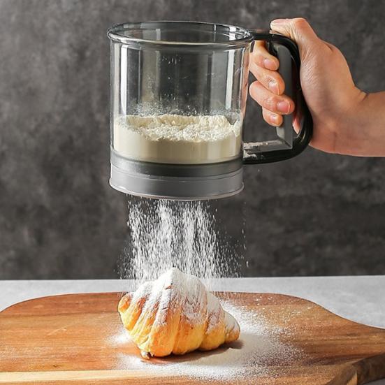 Doppelschichtige Struktur mit genauer Messung: Die innovative obere Schicht fungiert als transparenter Messbecher mit deutlichen Skalenmarkierungen zur präzisen Messung der Zutaten.. Darunter befindet sich ein feines Sieb, das Klumpen und Verunreinigungen aus Mehl oder pulverförmigen Zutaten effizient entfernt und glatte, gleichmäßig gesiebte Ergebnisse garantiert, die für eine gleichbleibende Backqualität unerlässlich sind.
