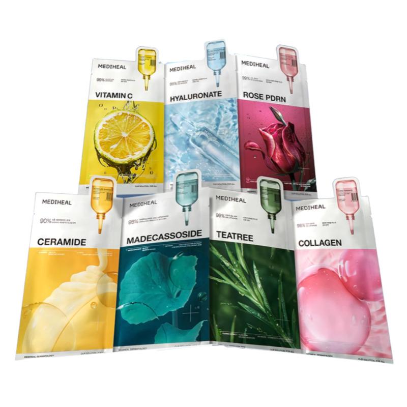 A customizable high-function sheet mask set from MEDIHEAL featuring 7 targeted formulas for different skin concerns. Each mask delivers concentrated active ingredients to deeply hydrate, soothe, brighten, firm, and repair the skin in just one use. Select your preferred function and enjoy professional-level sheet mask care at home.