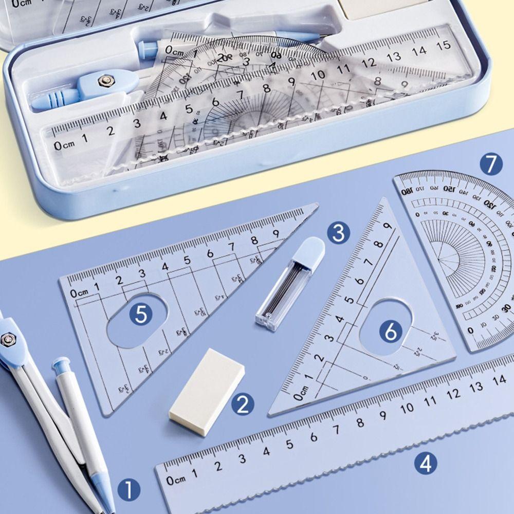 8PCS/Set Plastic Ruler Compasses Set Eraser Straight Ruler Protractor Transparent Set Square Measuring Ruler School Office