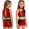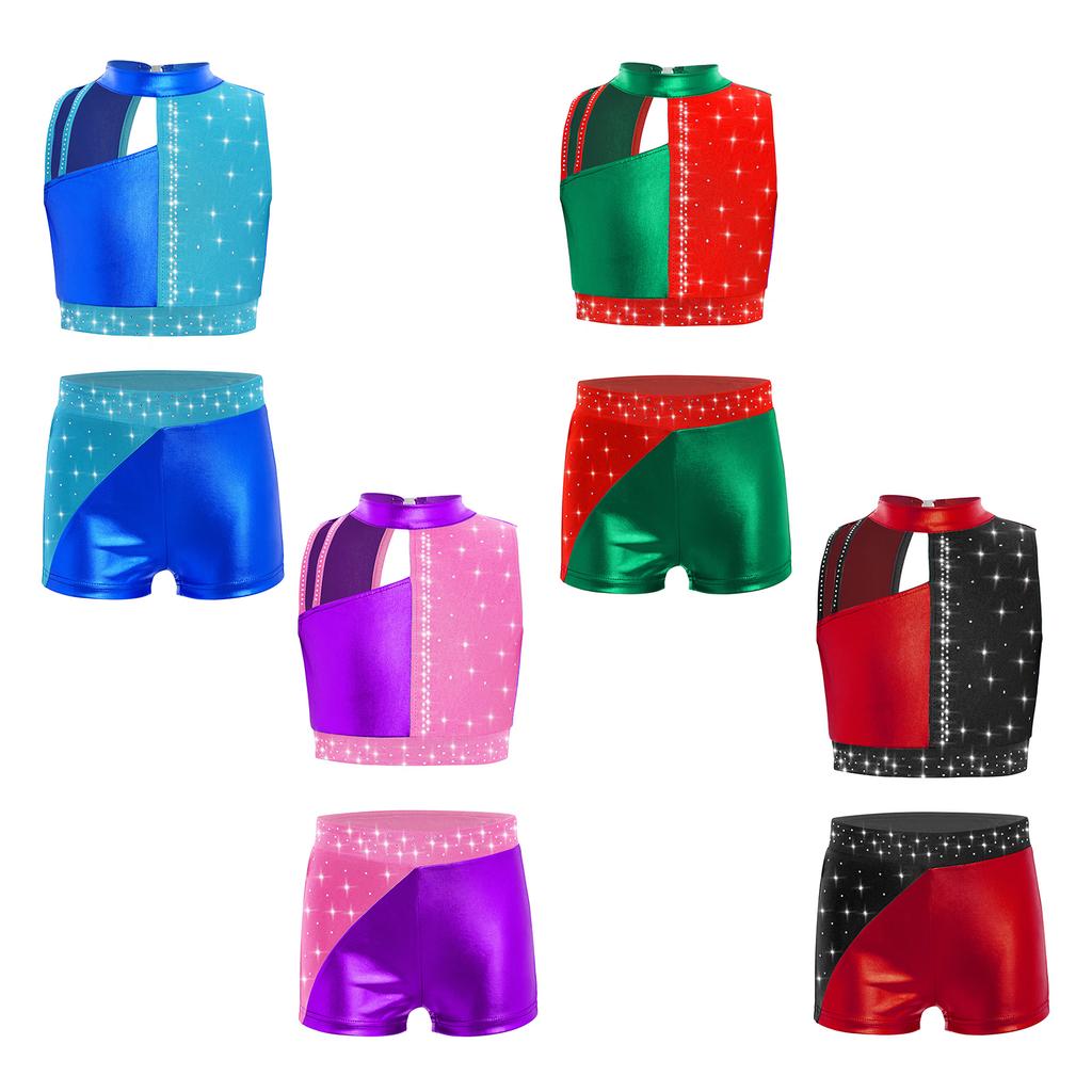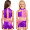 Funkelndes Strass-Performance-Outfit für Mädchen: Metallisches Colorblock Crop-Top mit passender elastischer Shorts für die Bühne