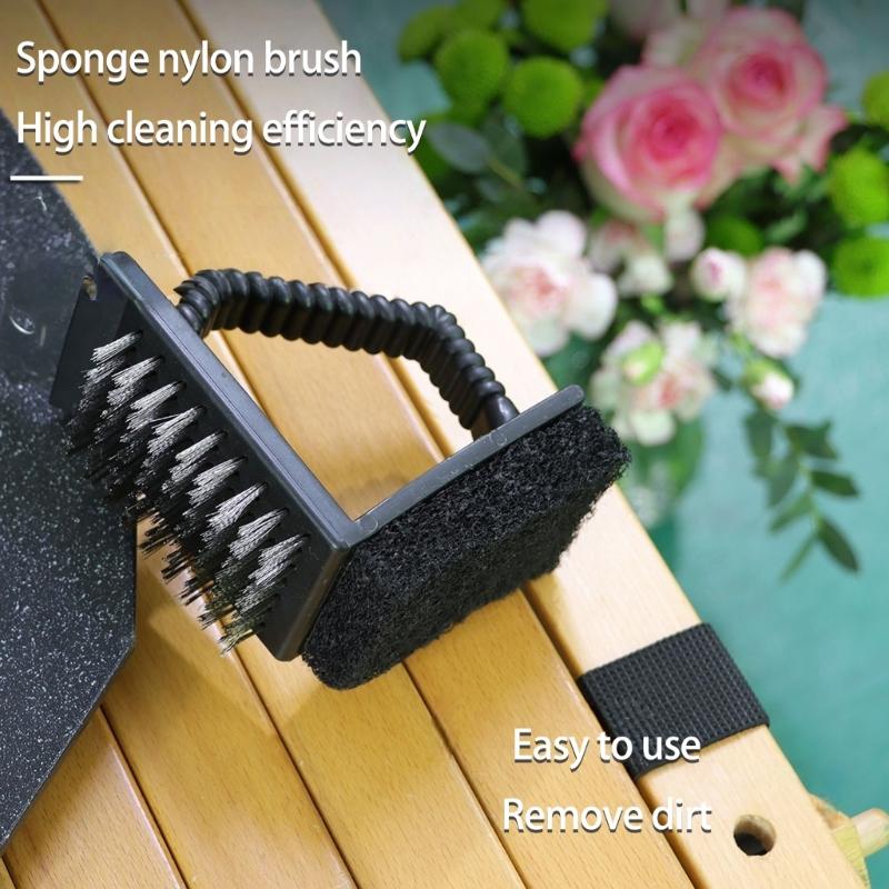 Upgrade your grills maintenance with this stainless steel BBQ brush featuring a builts in scraper, sponge nylon brush, and dense copper bristles for efficient removal of stubborn grease and residues.